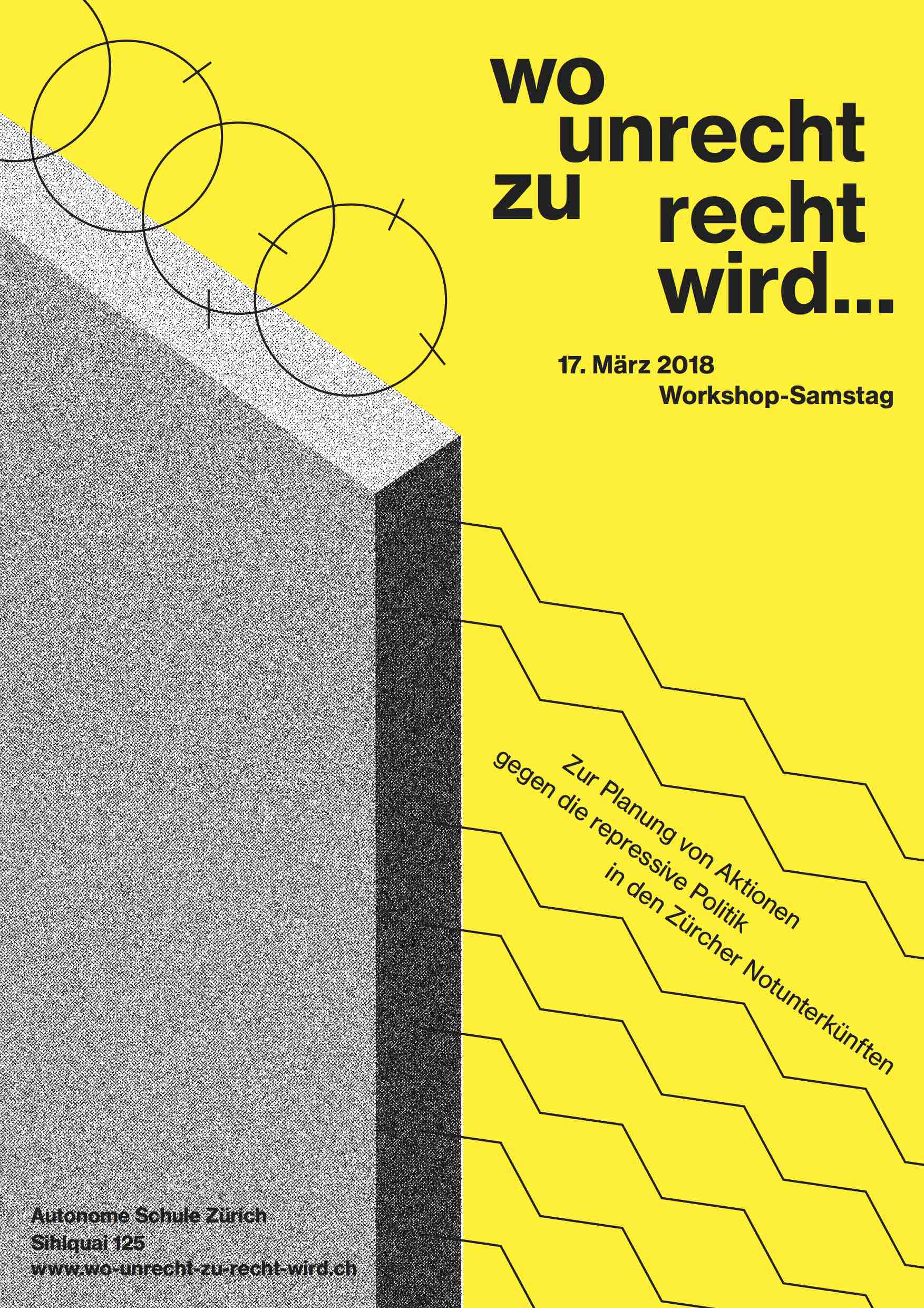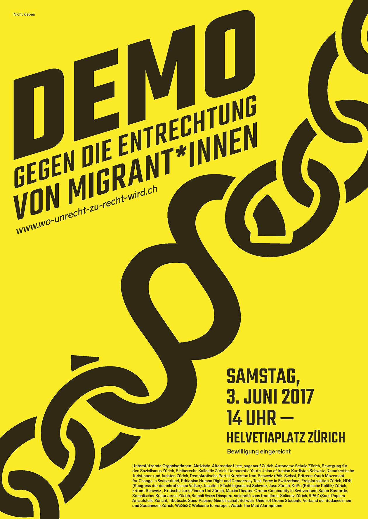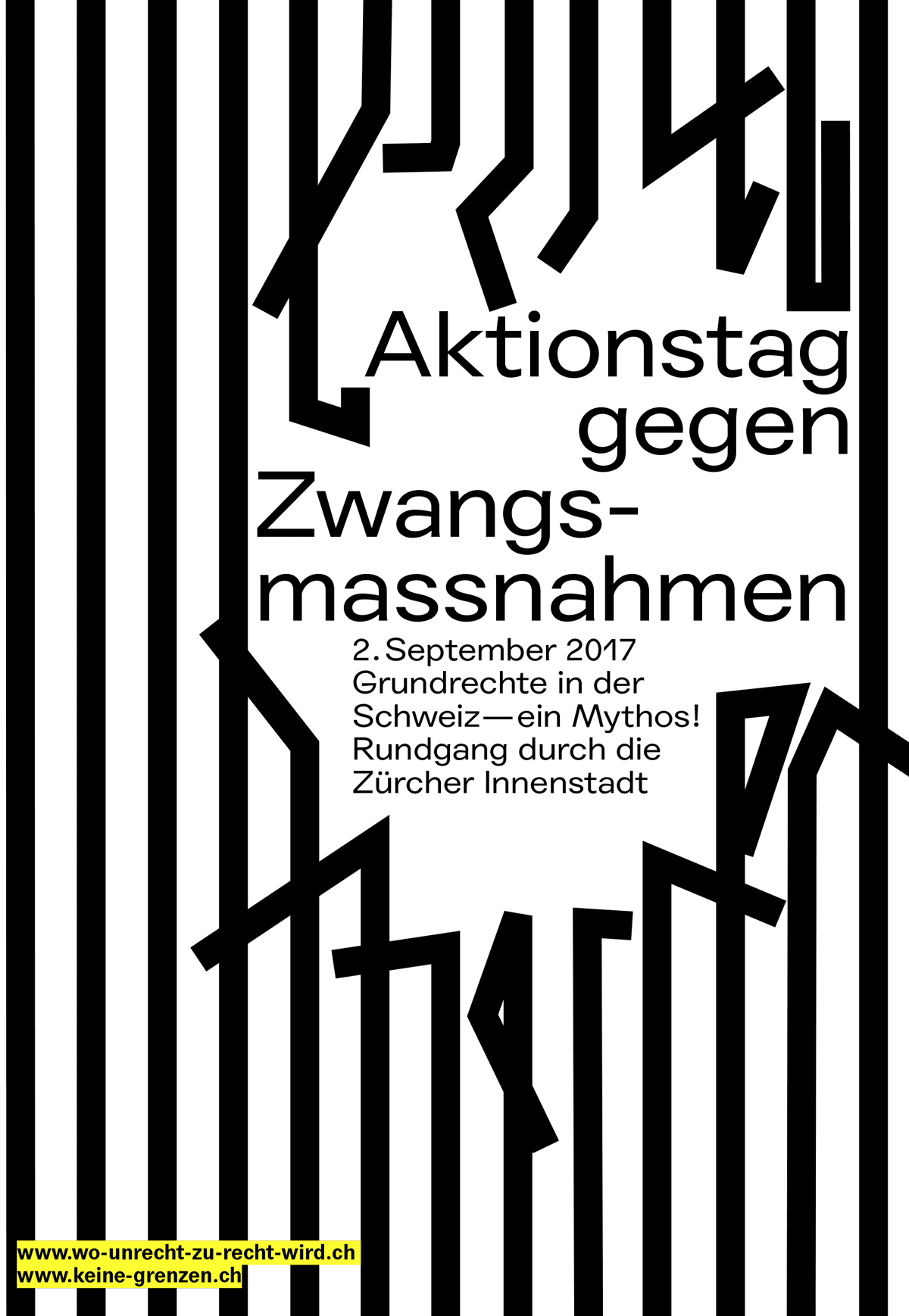 Am Samstag, dem 2. September 2017, fand von 11 bis 17 Uhr ein Aktionstag gegen diese zunehmende Entrechtung mit Veranstaltungen in der ganzen Schweiz statt. In Zürich führte ein Rundgang durch die Innenstadt an sieben Käfigen mit Gegenständen vorbei, welche symbolisch für elementare Rechte stehen, die Menschen aufgrund ihres blossen Daseins verwehrt werden. Ausserdem informierten Aktivist*innen des Bündnisses «Wo Unrecht zu Recht wird…» Passant*innen an einem Stand auf der Rathausbrücke.